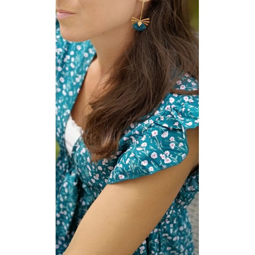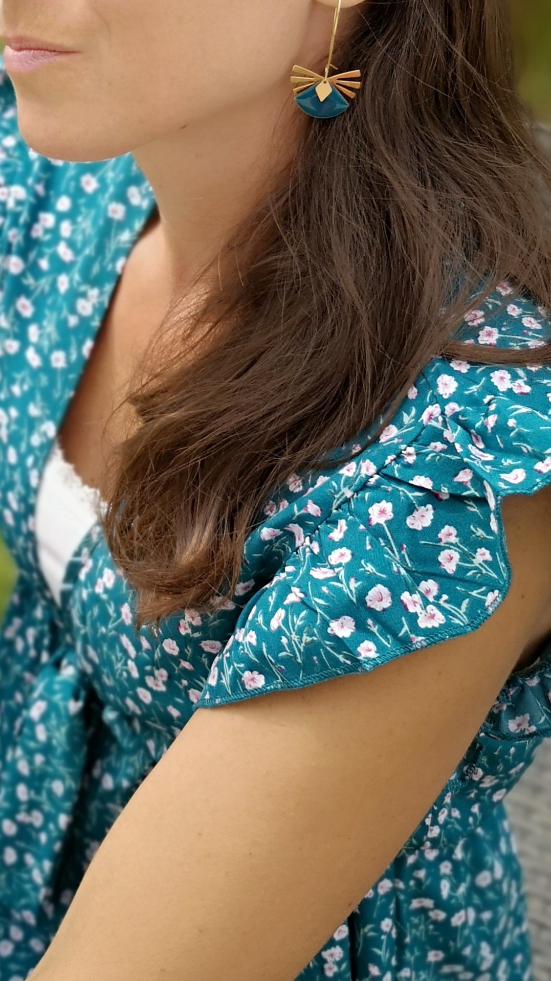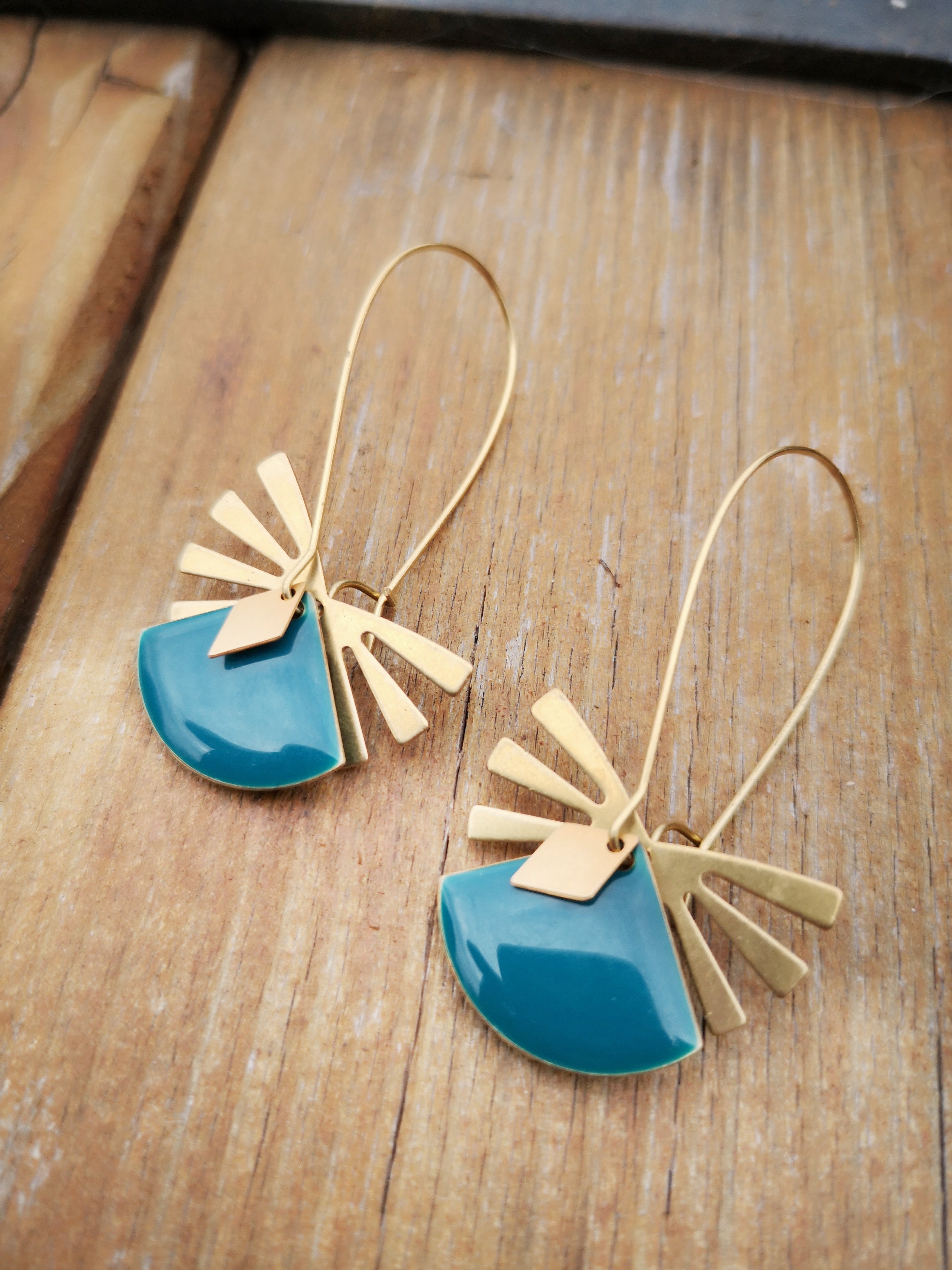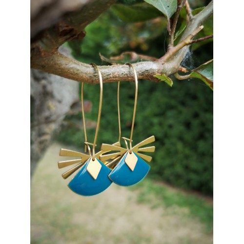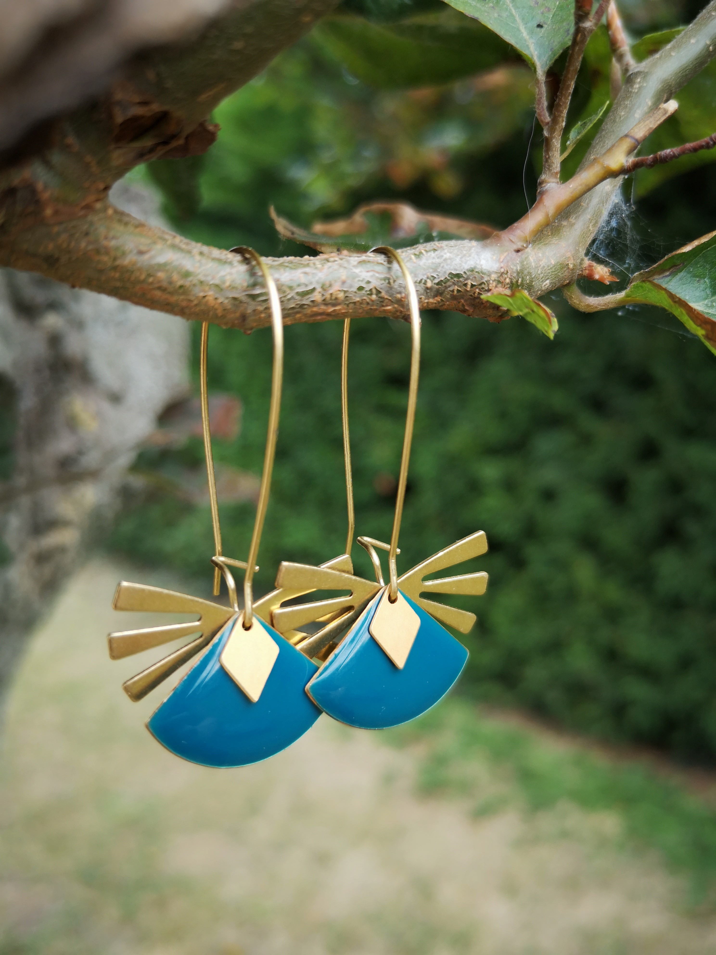 Osez cette paire de boucles d'oreilles handmade en laiton brut, assemblage sur dormeuse sans nickel et sans plomb avec son sequin bleu canard, ses breloques éventail et losange.