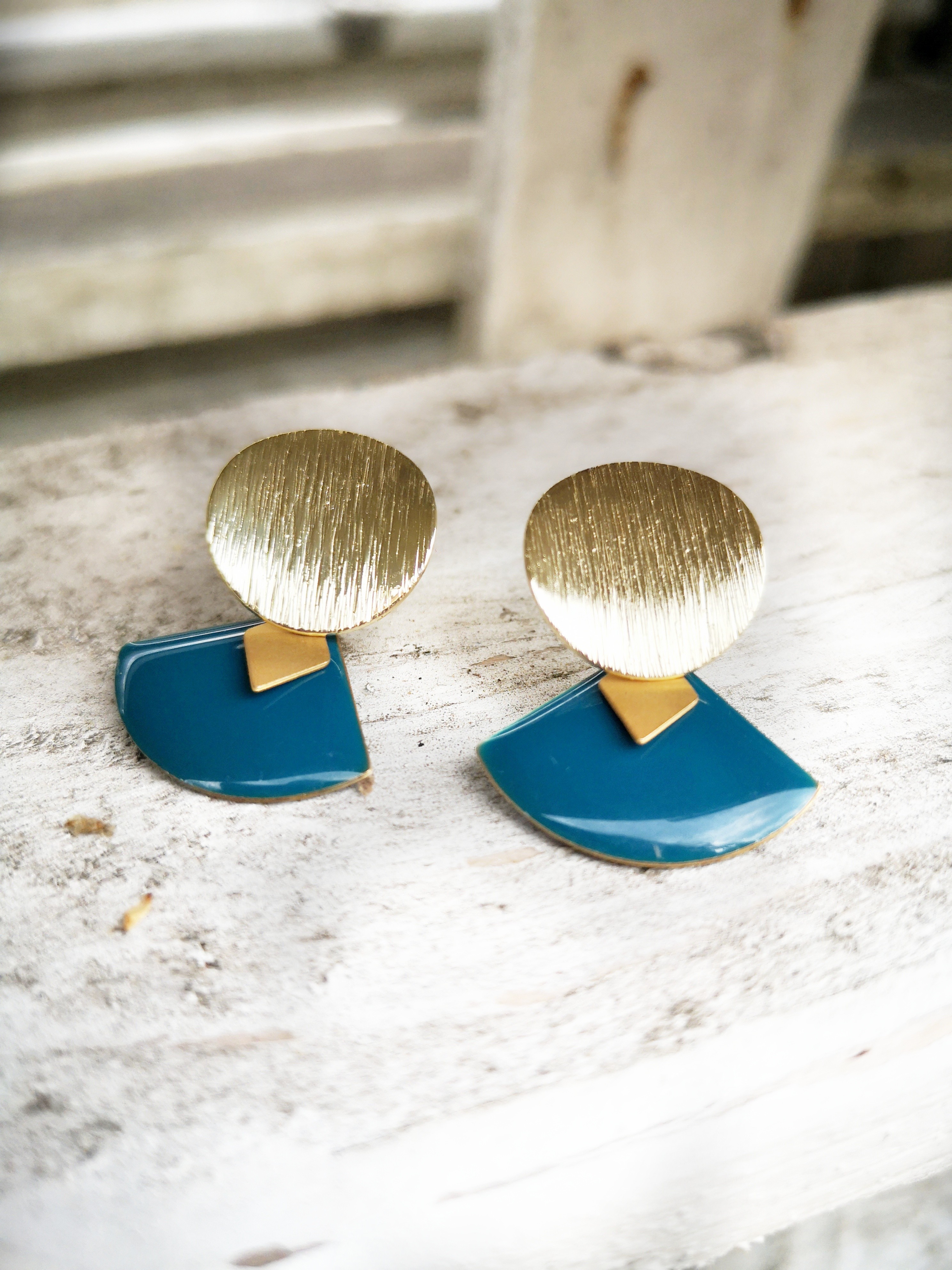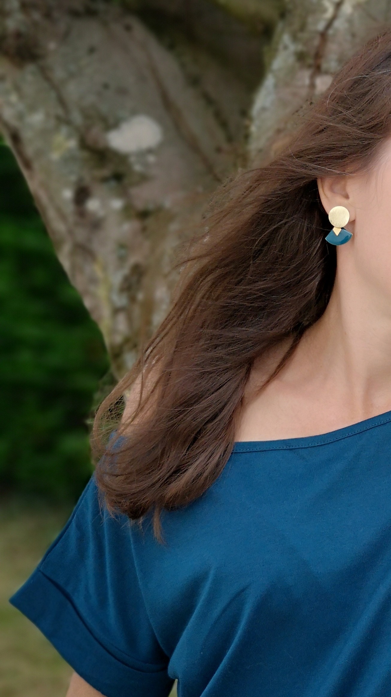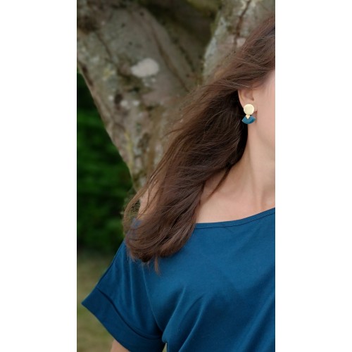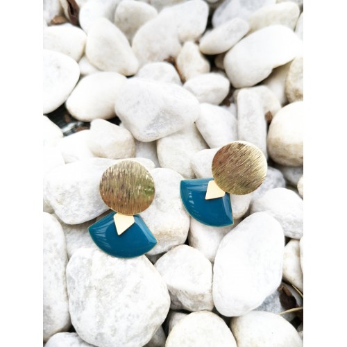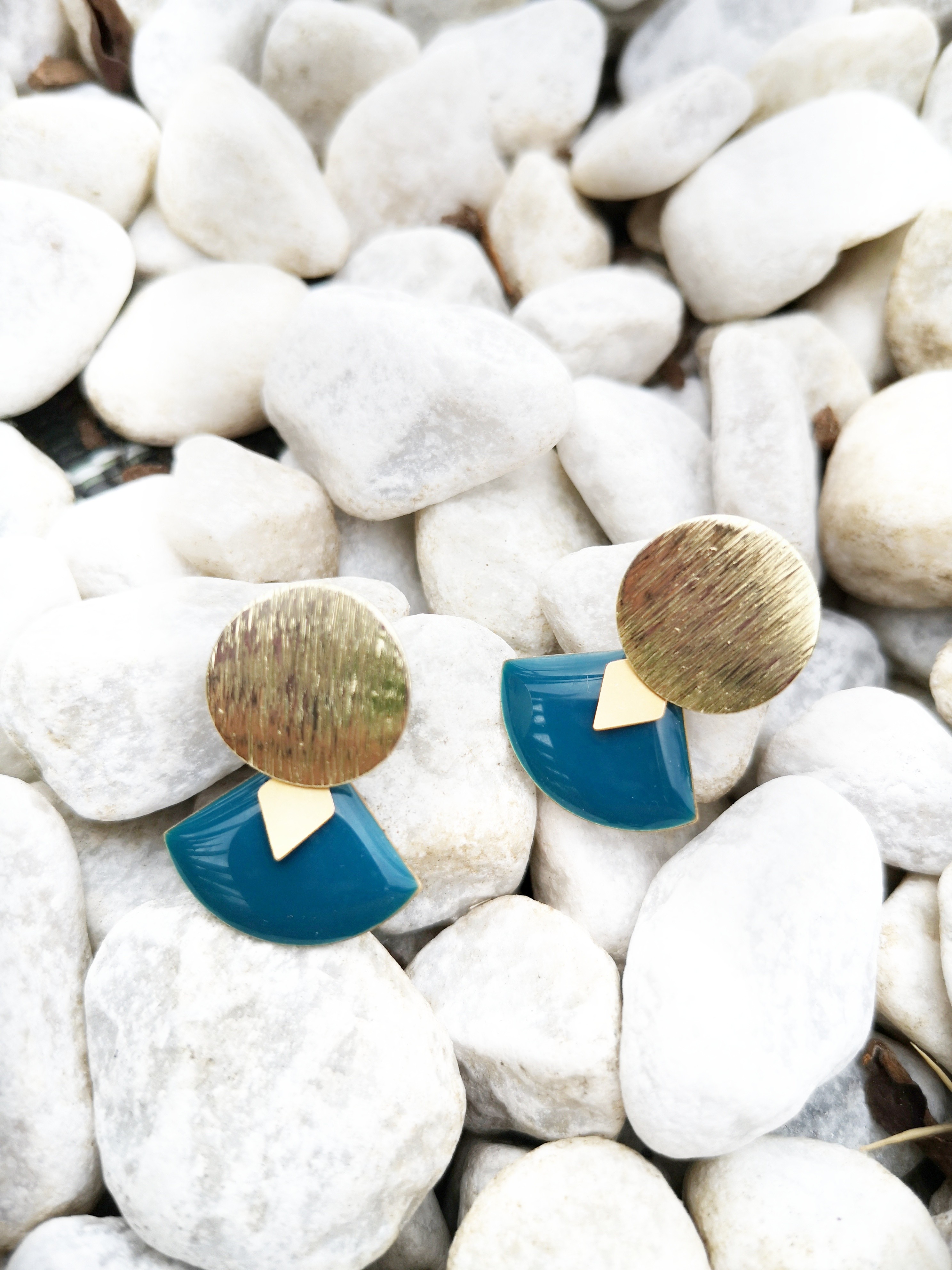 Osez cette paire de boucles d'oreilles handmade, assemblage sur clou cercle incurvé doré cantOr de 15mm sans nickel et sans plomb avec son sequin bleu canard 20x15mm, sa breloque losange éventail.